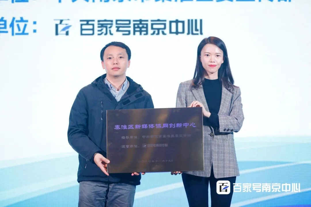 授牌仪式上,秦淮区委网信办专职副主任祝鲲鹏向百家号南京中心授予“秦淮区新媒体协同创新中心”称号。秦淮区宣传部将携手百家号南京中心共同为南京的内容创作者持续提供优质的平台和资源,打造自媒体孵化基地,推动南京内容生态的发展。